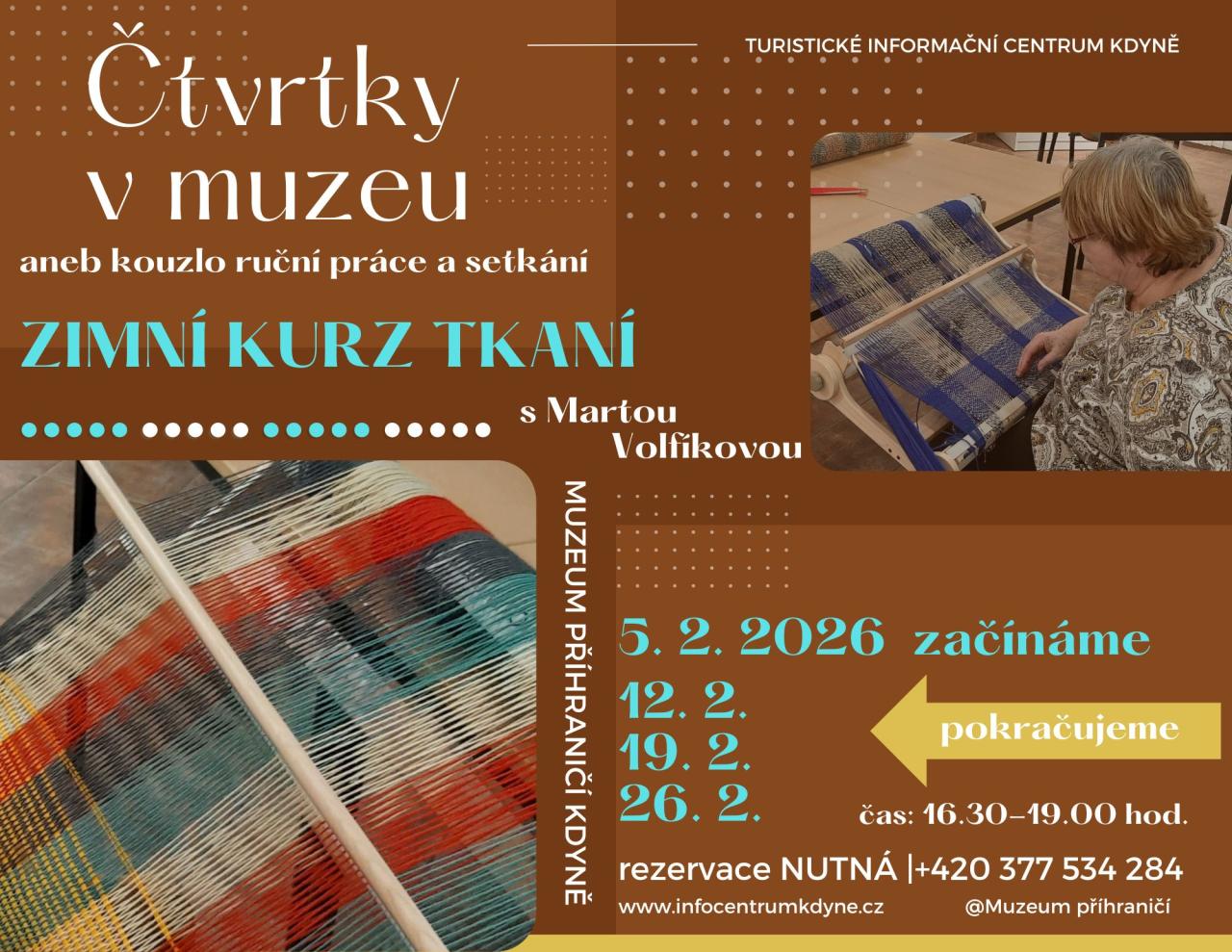 Muzeum příhraničí ve Kdyni pořádá kurz tkaní, který začne 5. února 2026.Během kurzu se seznámíte s různými technikami tkaní a budete mít možnost vytvořit si vlastní výrobek. Pojďte s námi zažít 4 mrazivé čtvrtky v teplíčku, při čaji, nebo svařáku a v přátelské a tvořivé atmosféře. Máme pouze 6 stavů, tudíž je potřeba si místo v kurzu včas rezervovat.